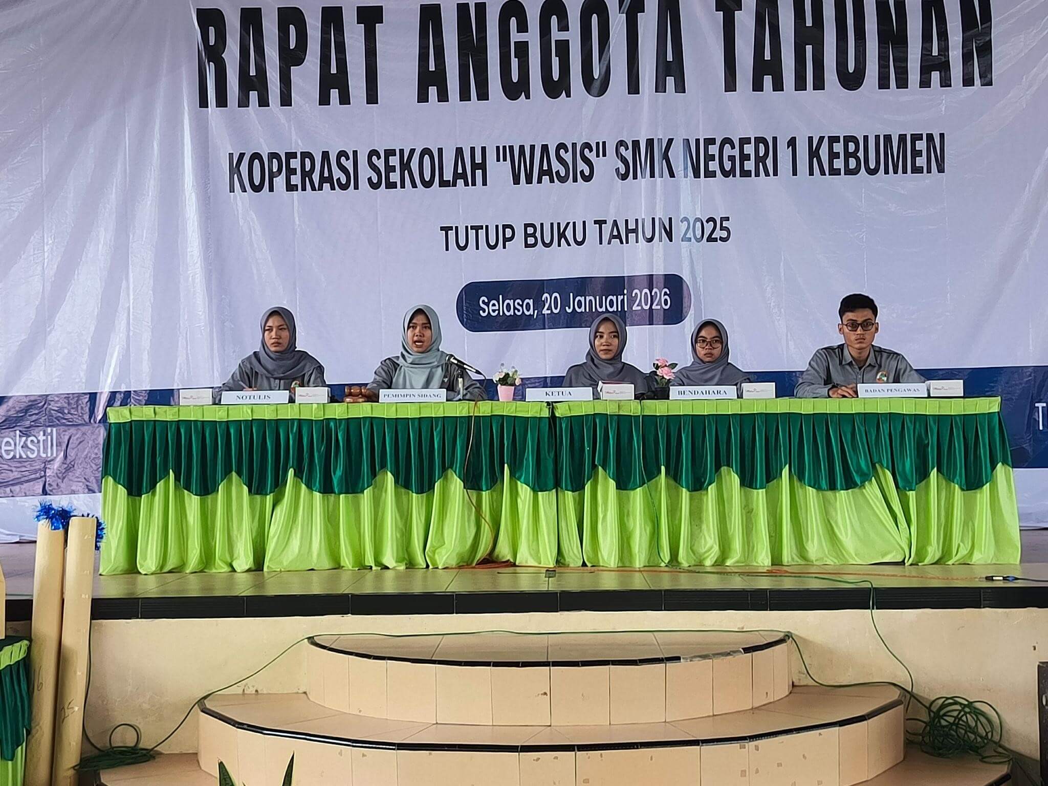 Kebumen — Selasa 20 Februari 2026, Koperasi Sekolah “Wasis” SMK Negeri 1 Kebumen melaksanakan Rapat Anggota Tahunan (RAT) Tutup Buku Tahun 2025 yang dirangkaikan dengan reorganisasi kepengurusan koperasi, bertempat di Indoor SMK Negeri 1 Kebumen. Kegiatan ini merupakan agenda rutin tahunan sebagai bentuk pertanggungjawaban pengelolaan koperasi kepada seluruh anggota.